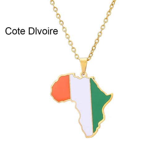 Africa Map Flag Pendant Necklace Gold Color Stainless Steel Ghana Nigeria Congo Somalia Angola Liberia African Jewelry Gift