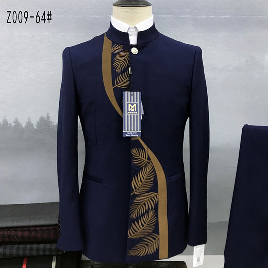 Fashion New Men's Casual Boutique Chinese Stand Collar Tunic Design Suit 2 Piece Set Blazers Jacket Coat Pants Trousers