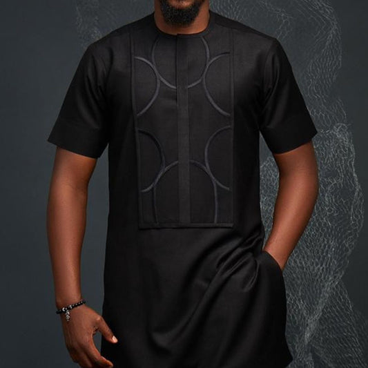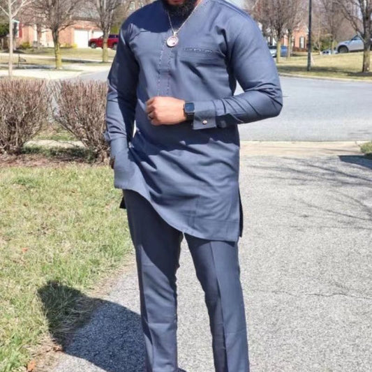 Summer New African Men's Short Sleeve Suit Solid Color Stitching Shirt and Casual Pants 2 Piece Set Party Marriage Men's Set