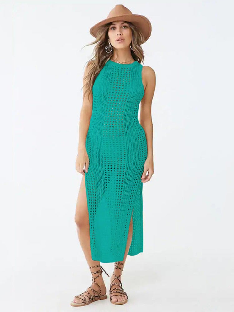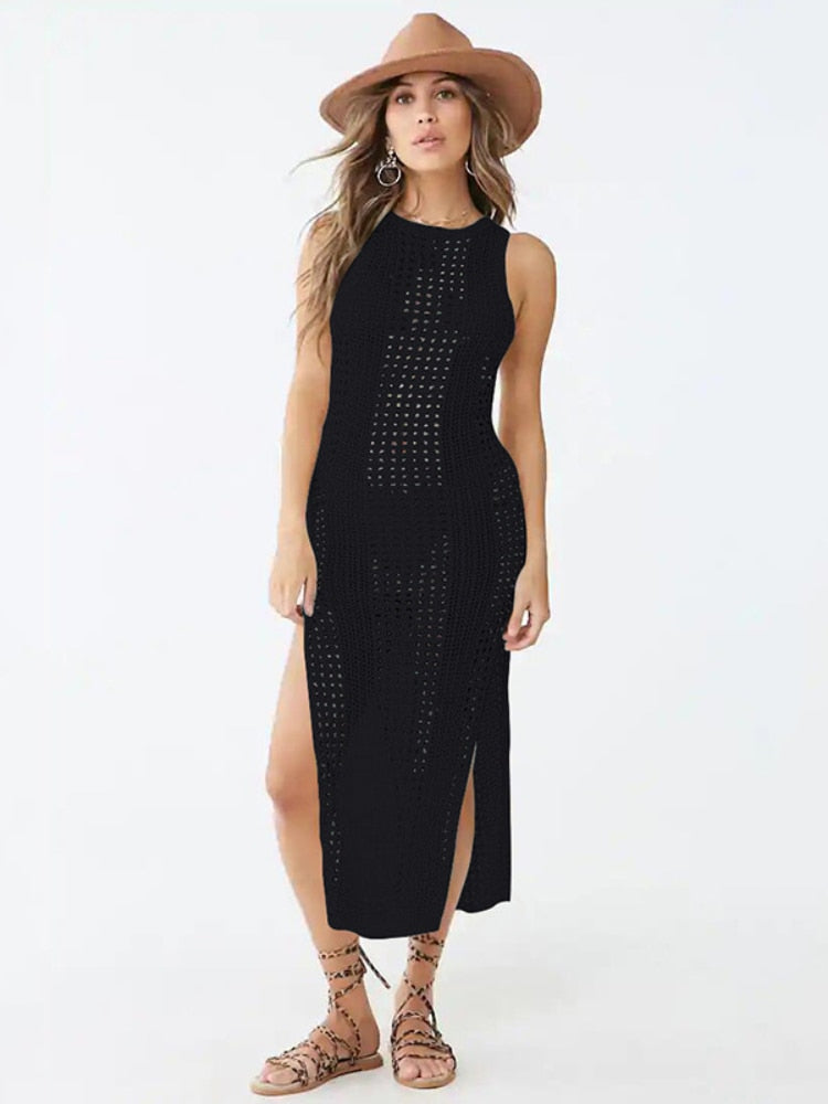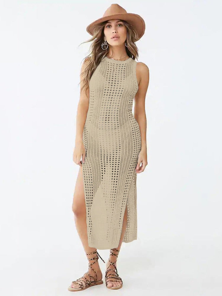 Bikini Cover Up Women Sleeveless Crochet Dresses Knitted Beach Tunic Solid Side Split O Neck Summer Seaside Bathing Suits