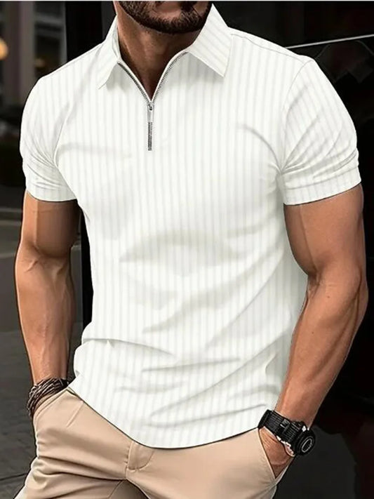 Summer Men Stripe Fashion Short Sleeve Lightweight Business Casual Polo Shirt Half Zip Solid Elastic Office Short Sleeve T-shirt